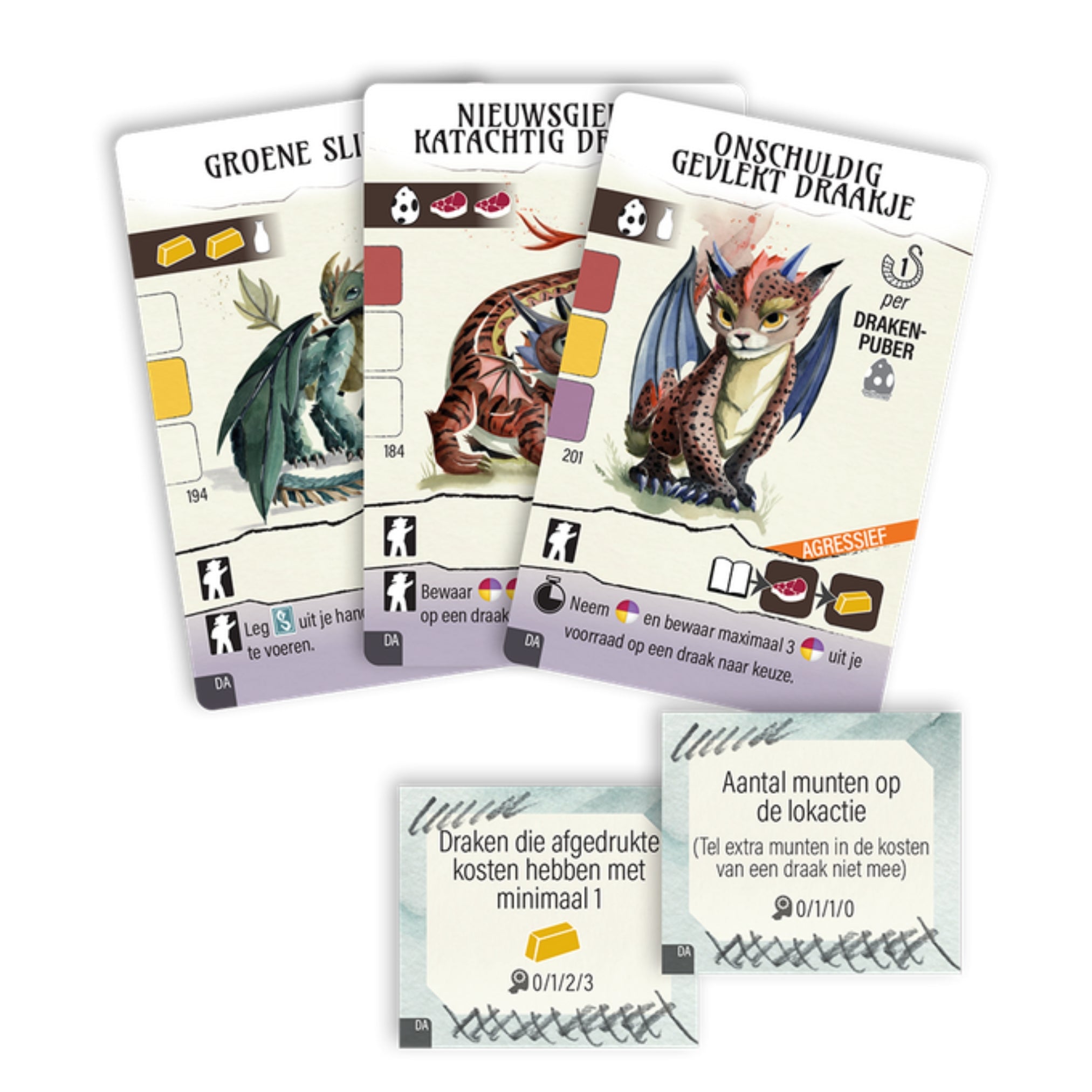 Ersetze die benötigten Materialien durch die neuen Komponenten. Füge anschließend alle Drachenkarten, Höhlenkarten, Drachengilden und Missionskarten ihren jeweiligen Stapeln hinzu. Wenn ein Spieler passt, bietet das neue Rundentableau zusätzliche Optionen. Die neuen Drachenjungen können außerdem auf einzigartige Weise trainiert werden!